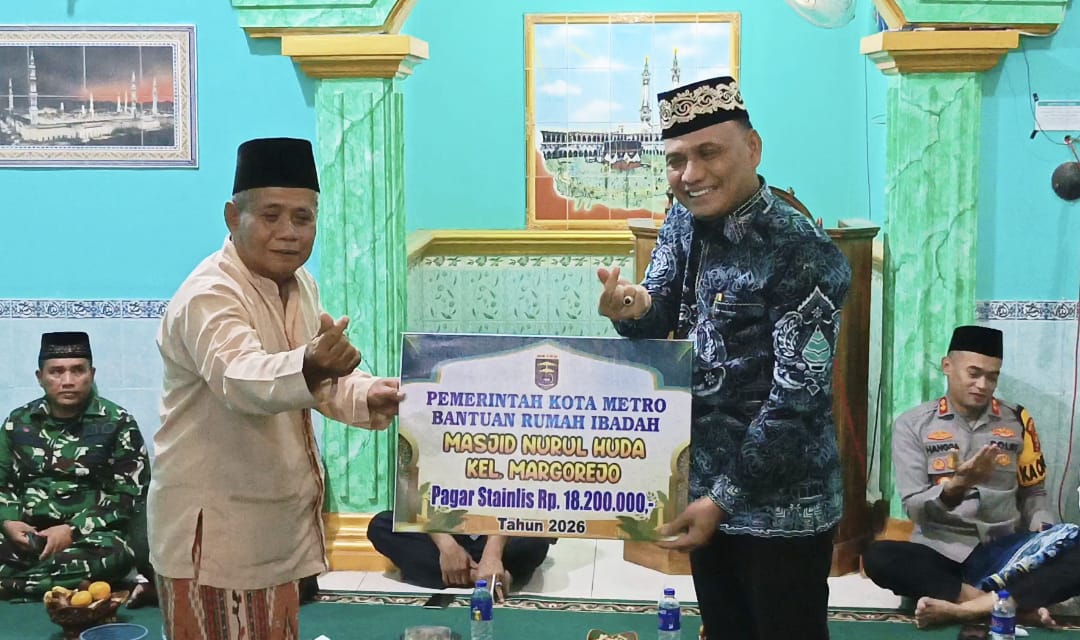 METRO — Pemerintah Kota Metro kembali menggelar kegiatan Safari Ramadhan dengan menyalurkan bantuan pembangunan sarana ibadah, berupa pagar stainless senilai Rp 18.200.000, di Masjid Nurul Huda, Kelurahan Margorejo, Kecamatan Metro Selatan.